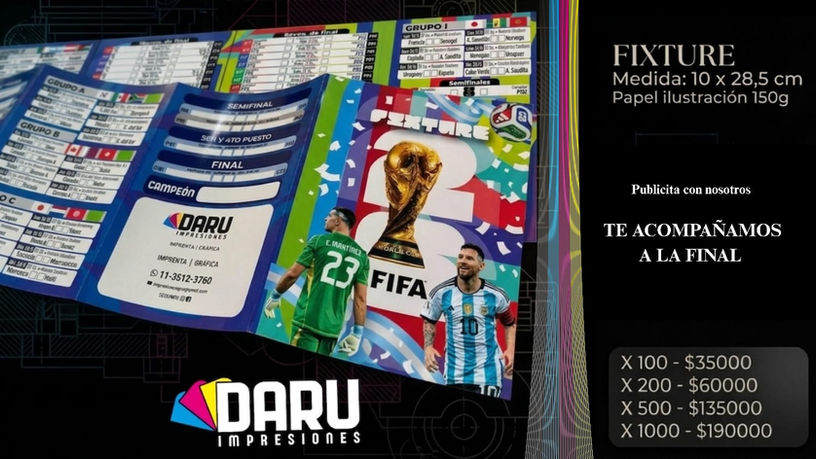 Daru Impresiones ofrece soluciones integrales de impresión: digital láser, offset y gran formato, además de servicios de fotocopiado y ploteo. Nos especializamos en papelería comercial, indumentaria, materiales publicitarios y señalética, con servicio de instalación incluido.